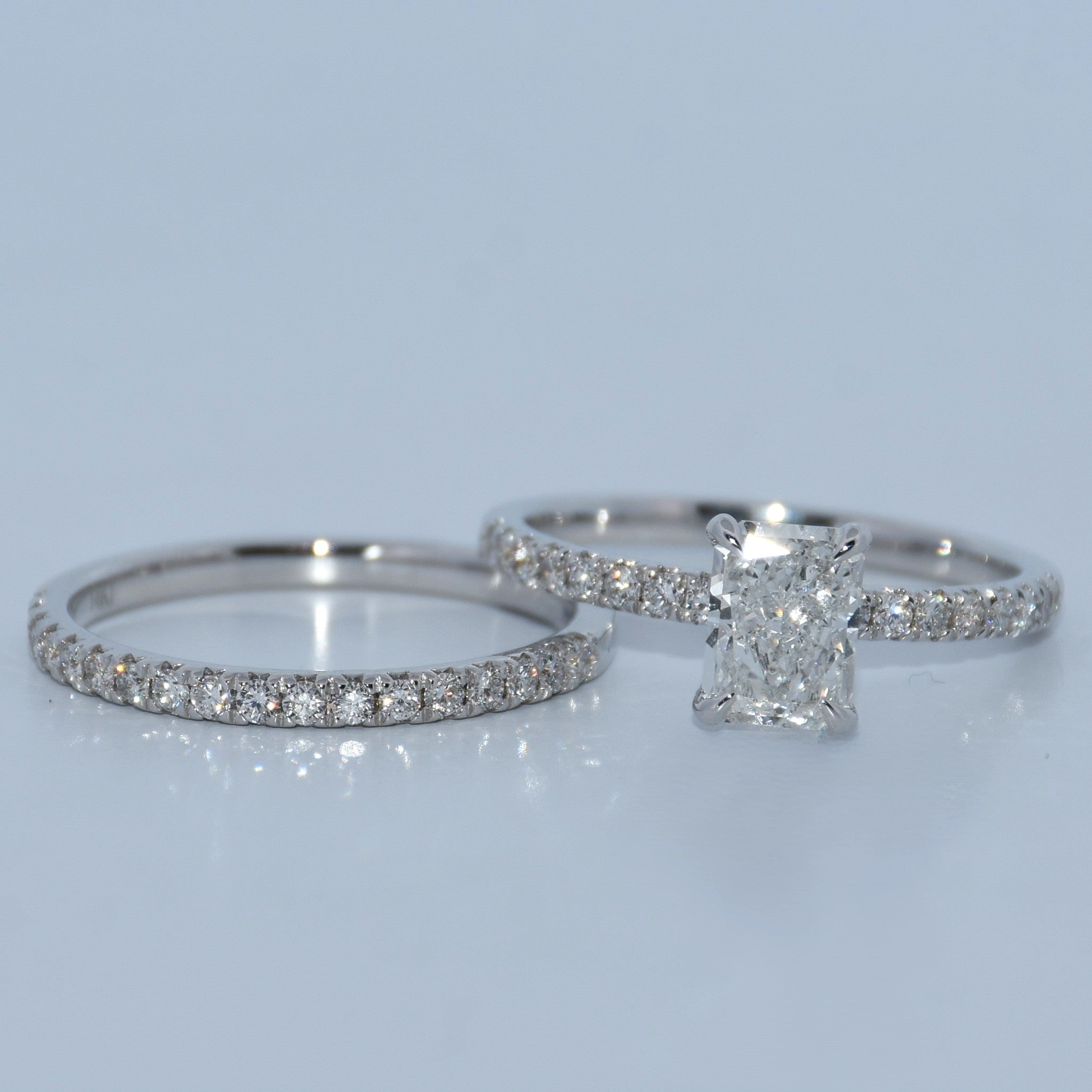 - Center Stone: 1CT Radiant Cut Lab Diamond - Metal: 14K White Gold - Includes Matching Wedding Band - Accent Stones on Band & Prongs